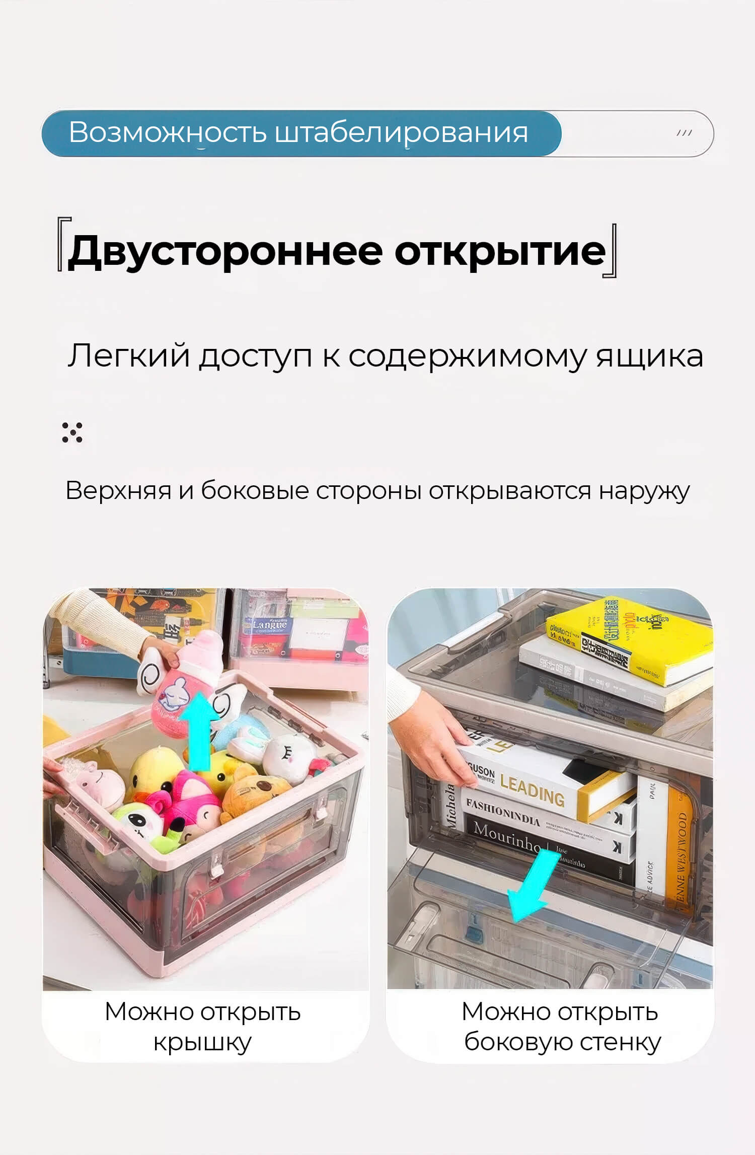 Пластиковая коробка с крышкой надежно защищает вещи от пыли и влаги, сохраняя их в чистоте. Прочная конструкция выдерживает ежедневные нагрузки, а складной механизм позволяет компактно хранить ящик, когда он не используется.